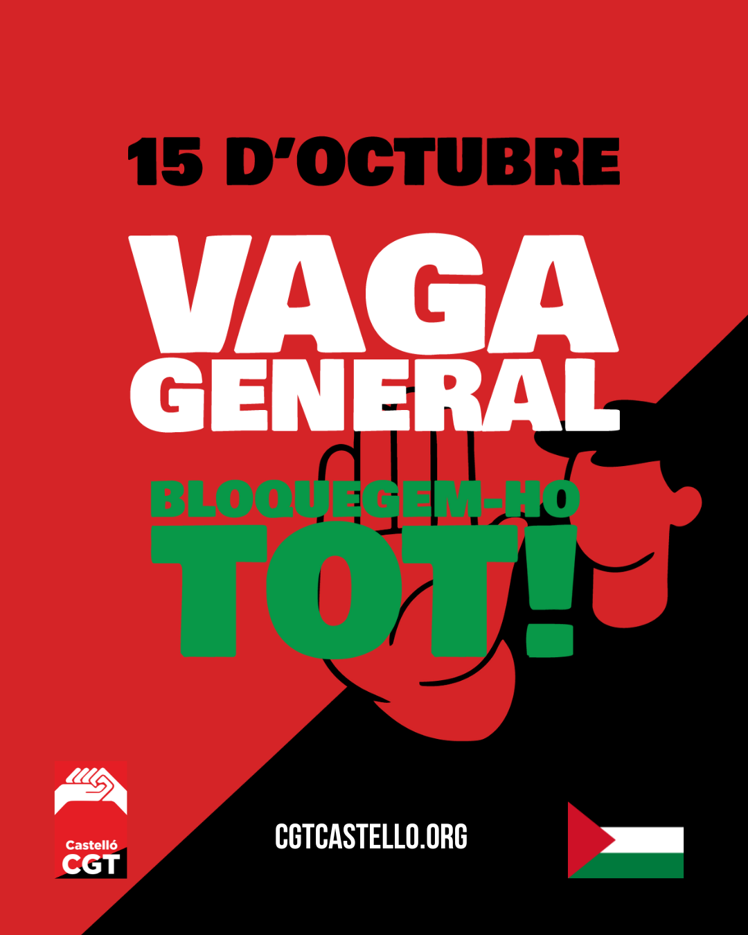 El 15 d’octubre la CGT convoquem una Vaga General de 24 hores. Descarrega, imprimeix, comparteix i difon els materials perquè la vaga arribi a tots els municipis i centres de treball. Aturem el genocidi del poble palestí. Bloquegem-ho TOT!