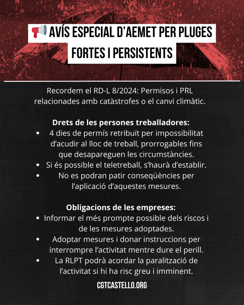Un permís climàtic de 4 dies per impossibilitat d’acudir al centre de treball o que les empreses compten amb un protocol de PRL davant catàstrofes i fenòmens meteorològics són algunes de les mesures aprovades.